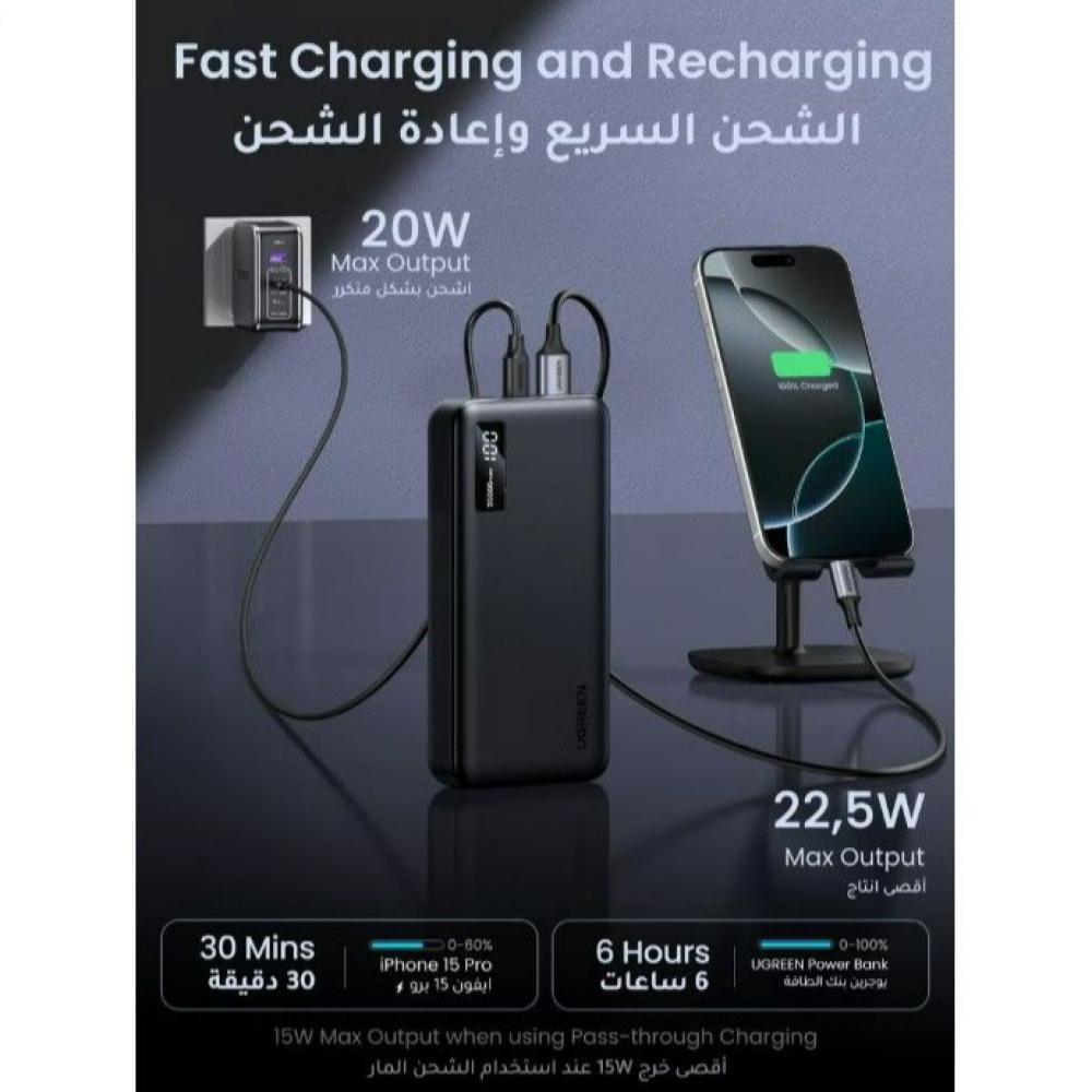 لا مزيد من القلق بشأن نفاد البطارية مع باور بانك UGREEN بسعة 20000mAh. بفضل تقنية الشحن السريع بقدرة 22.5W، يمكنك شحن هاتفك الذكي وأجهزتك الأخرى في وقت قياسي وبأمان كامل. تصميم عملي مع شاشة عرض رقمية توضح مستوى الطاقة في الوقت الفعلي، ليبقى معك مصدر الطاقة الذكي أينما كنت – في السفر، العمل، أو الاستخدام اليومي.