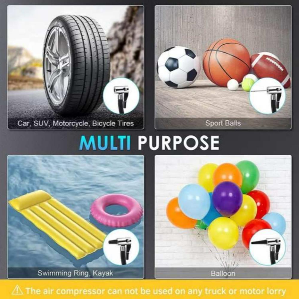 مزودة بـ 3 فوهات إضافية لنفخ إطارات السيارات، الدراجات، الكرات الرياضية، الألعاب الهوائية وحتى القوارب الصغيرة.